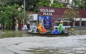 Mưa lớn kéo dài, miền Trung đi xuồng trên phố